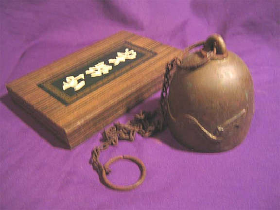 An exotic bronze bell packaged in an ancient tea box rings only when in
